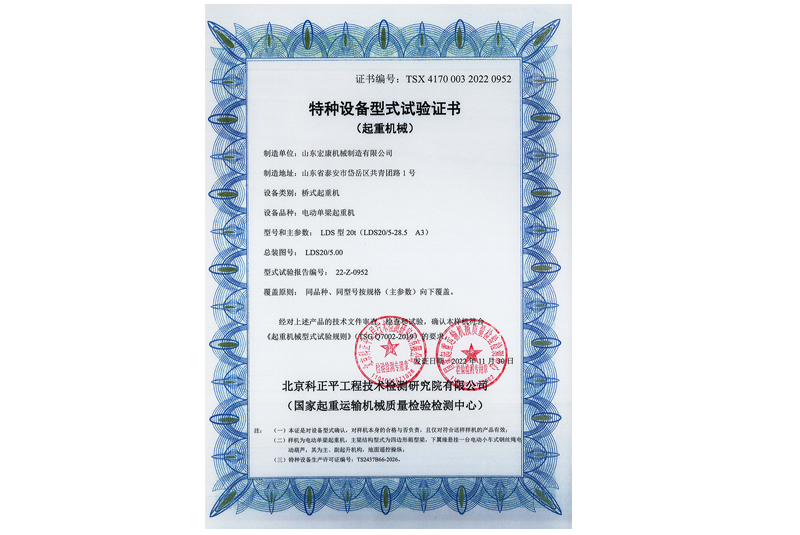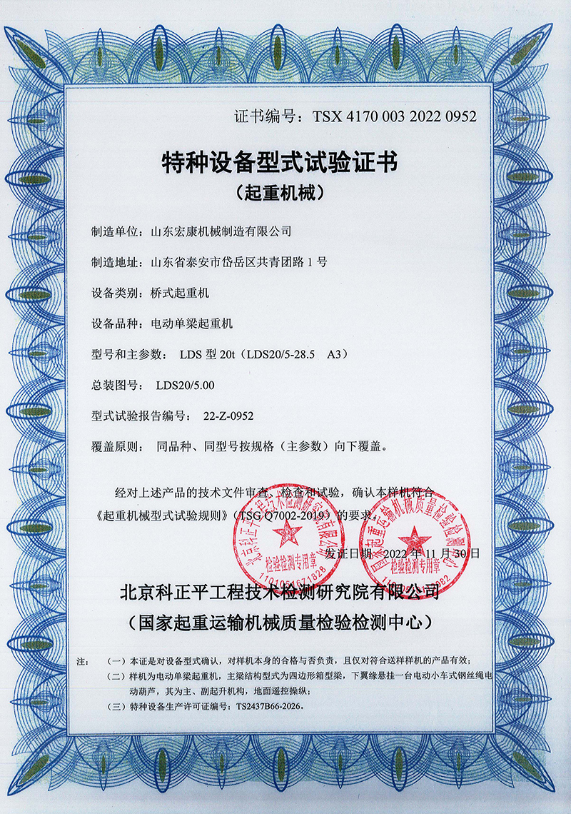 電動單梁橋式起重機型式試驗合格證
