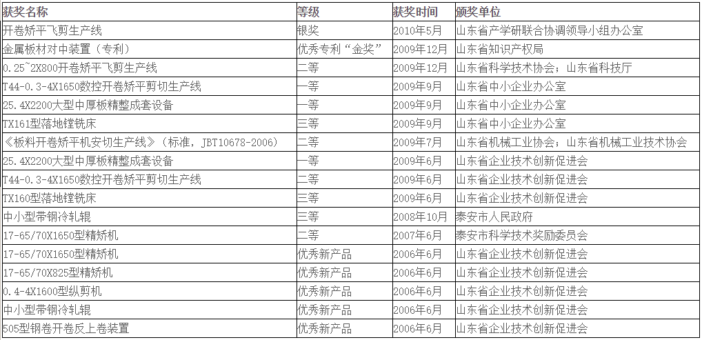 “25.4×2200大型中厚板精剪成套設(shè)備”榮獲中國機械工業(yè)科技進步二等獎和山東省科技進步二等獎,并被認(rèn)定為國家重點新產(chǎn)品;