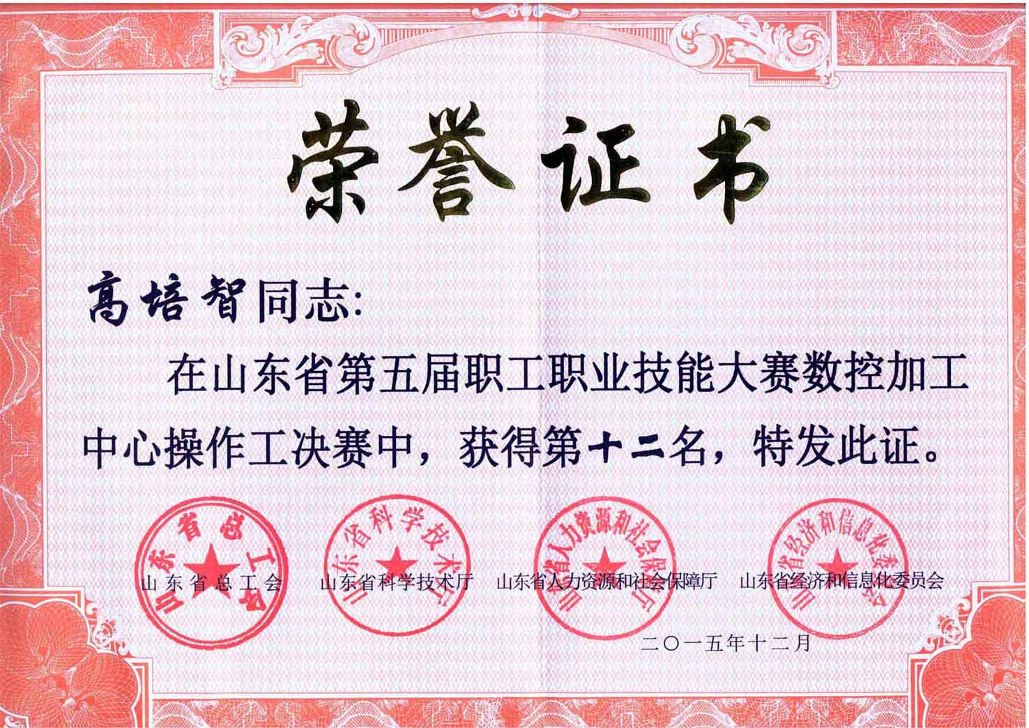公司員工高培智在山東省第五屆職工職業(yè)技能大賽數(shù)控加工中心操作工決賽中,獲得第十二名,日前受到省總工會、省科技廳、省人力資源和社會保障廳和省經(jīng)信委四部門聯(lián)合表彰。
